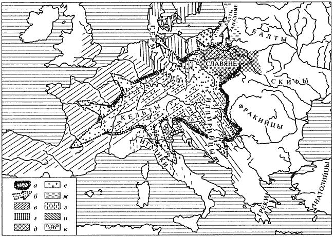 а- ареал среднеевропейской культурно-исторической общности полей погребальных урн: б - основные направления расселения; в - ареал западногальштатской культуры; г - ясторфской культуры; д - культуры подклешевых погребений; е - поморской культуры (окраинные балты); ж - западнобалтских курганов; з - культуры италийских племен; и - восточногальштатской культуры; к - культуры эсте