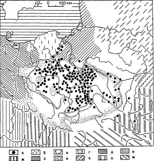 а — могильники с подклёшевыми погребениями; б — первоначальный регион поморской культуры; в — территория расселения племен поморской культуры; г — ареал лужицкой культуры; д — ясторфской культуры (германцы); е — западного гальштата (кельты); ж — восточного гальштата (иллирийцы); з — западно-балтских курганов (балты); и — штрихованной керамики (по В. Седову – территория восточных балтов); к — милоградской культуры; л — скифской культуры; м — дакийских племен.