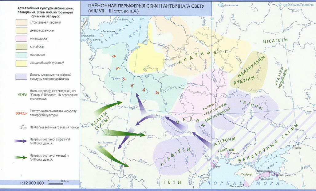 Отрывочные сведения о древнем населении будущей Беларуси дошли до нас благодаря описанию Скифии и прилегающих земель, сделанному в середине V в. до н.э. Геродотом.[13] Из многочисленных его толкований отметим высказанную С. Е. Рассадиным идею о том, что расселение некоторых народов, упомянутых Геродотом. не может быть точно соотнесено с ареалами археологических культур, а приходится скорее на их стыки.[14] Это может объясняться тем, что их материальные черты стали в это время очень похожими благодаря сильной «скифской вуали» – распространению престижных вещей, украшений, оружия и определенных мировоззрений, придавшему этим культурам характерный колорит. Пространство, частично затронутое влиянием скифов, археологически определяется как милоградская культура. Более-менее конкретные сведения Геродота касаются только ее южной части, которую вместе с прилегающей частью собственно скифской лесостепной культуры можно связывать с упомянутыми им неврами и скифами-земледельцами. Далее на север Геродот размещает полумифических «андрофагов» (людоедов). Видимо, так в сознании эллинов отразилось почти неизвестное им население культур штрихованной керамики и днепро-двинской, социальный уровень которых действительно выглядит более примитивным по сравнению с культурами скифского круга.
