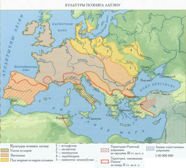 Рис. 5. Культуры позднего латена (карта автора из издания: Вялікі гістарычны атлас Беларусі у 3-х тамах. Т.1. Мінск: Белкартаграфія. 2009. С. 39).