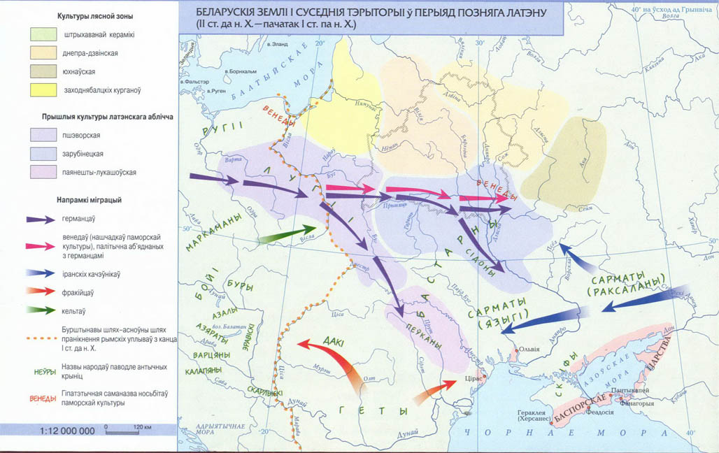 Очень важный для формирования будущих белорусов этап приходится на II век до н.э. – первую половину I века н.э., когда преемственность населения на территории Беларуси была нарушена сильными миграционными движениями. Доминирующим этносом в Западной и Центральной Европе в это время были кельты – создатели латенской культуры, давшей название целой эпохе. Культуры, сложившиеся под сильным кельтским влиянием, археологи называют латенизированными (к их числу принадлежат пшеворская, оксывская, зарубинецкая, поянешти-лукашевская). По археологическим данным, они сформировались в результате волны последовательных миграций, исходным пунктом которых была восточная окраина ясторфской культуры – в частности, ее губинская группа, впитавшая сильный субстрат предшествующей беловицкой культуры. Носители и ясторфской, и беловицкой культур являлись потомками традиции полей погребальных урн, при этом ясторфская культура довольно надежно отождествляется с ранними германцами. Во всех латенизированных культурах прослеживается ясторфский компонент, а своеобразие каждой из них придает его сочетание с другими компонентами. При этом вклад собственно кельтов представляется археологам минимальным. Скорее это была кельтская «вуаль», сменившая скифскую.