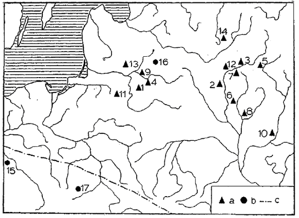 Рис. 14. Находки наконечников стрел гуннского типа (по А. Б. Лухтану)