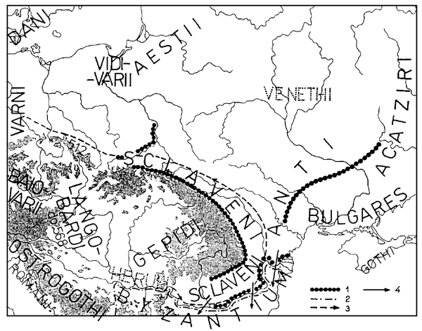 1 – границы расселения славян и антов; 2 – северная граница Византии; 3 – предположительный путь миграции герулов, описанной Прокопием Кесарийским; 4 – направления нападений славян на Византию
