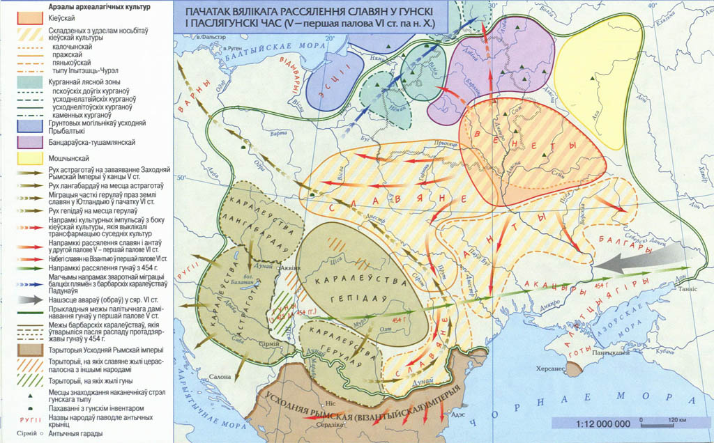 Рис. 17. Начало великого расселения славян в гуннское и послегуннское время. V– первая половина VIв. (карта автора из издания: Гістарычны атлас Беларусі. Т. 1: Беларусь ад старажытных часоў да канца XVIIIст. Варшава, 2008. С. 40).