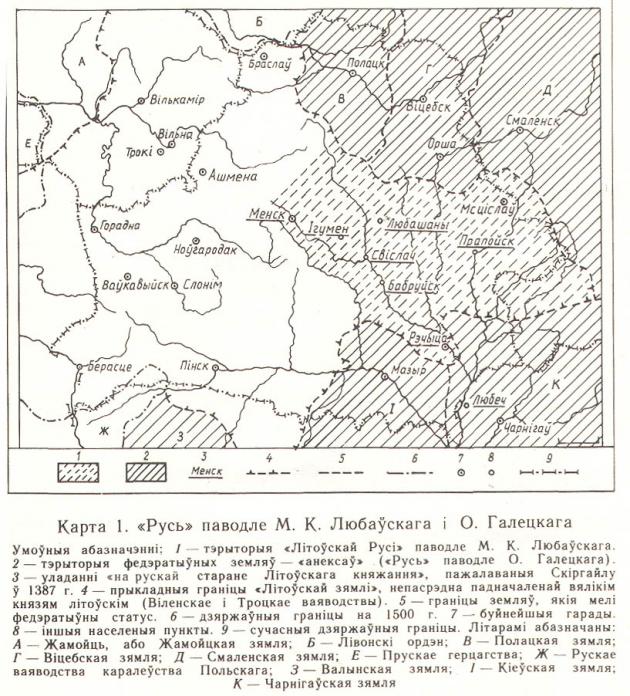 Погляды М. К. Любаўскага поўнасцю былі ўспрыняты польскім гісторыкам С. Кутшэбам [37, с. 5—7]. Але О. Галецкі даў іншае тлумачэнне тэрміна «Русь». На яго думку, уся тэрыторыя Віленскага і Троцкага ваяводстваў (па адміністрацыйна-тэрытарыяльным падзеле ВК.Л да рэформы 1565 г., гл.: 13) лічылася «Літвой», а пад «Руссю», ці «Руссю Літоўскай», трэба разумець тыя далучаныя старажытнарускія землі («анексы»), якія мелі федэратыўны статус на падставе велікакняжацкіх прывілеяў,— Полацкую, Віцебскую і іншыя [35, с. 7—25]. Розніцу ў поглядах М. К. Любаўскага і О. Галецкага адлюстроўвае карта 1***.