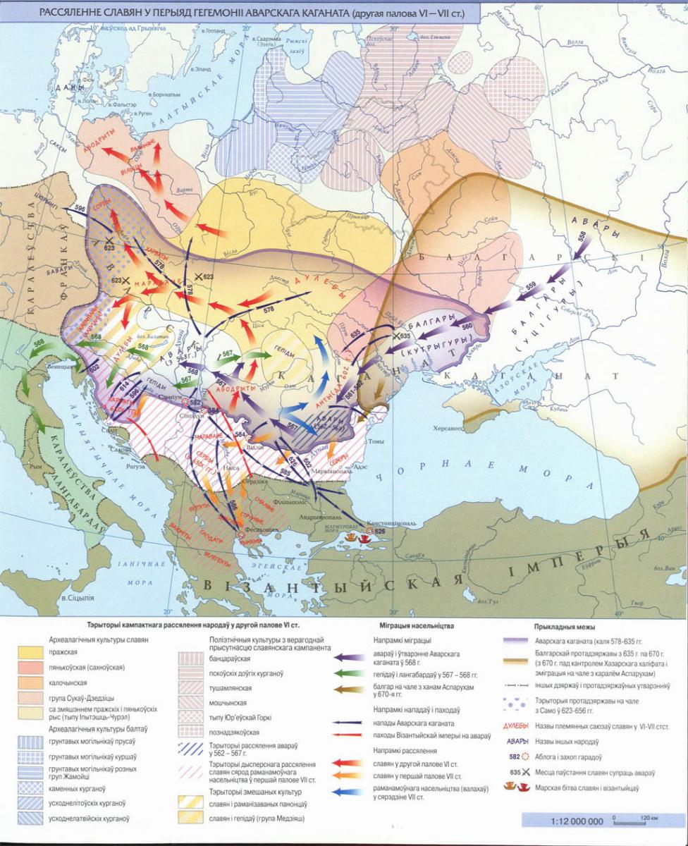 Рис. 19. Расселение славян в период гегемонии Аварского каганата. Вторая половина VI– VII в. (карта автора из издания: Гістарычны атлас Беларусі. Т. 1: Беларусь ад старажытных часоў да канца XVIIIст. Варшава, 2008. С. 41).