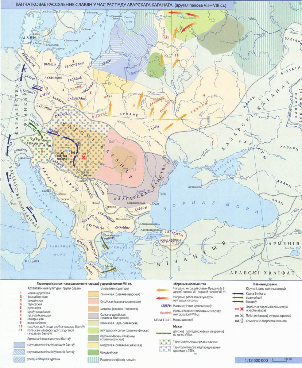 Рис. 20. Завершение расселения славян во время распада Аварского каганата. Конец VII– VIII в. (карта автора из издания: Гістарычны атлас Беларусі. Т. 1: Беларусь ад старажытных часоў да канца XVIIIст. Варшава, 2008. С. 42).