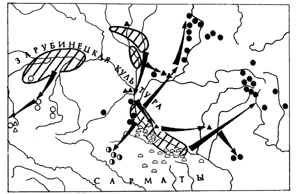 Рис. 8. Распад зарубинецкой культуры и образование групп позднезарубинецких памятников. По: Обломский А.М., Терпиловский Р.В. Среднее Поднепровье и Днепровское Левобережье в первые века нашей эры. М., 1991.