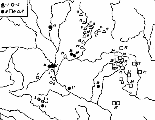 Рис. 9. Основные группы позднезарубинецких памятников (по А. М. Обломскому и Р. В. Терпиловскому)