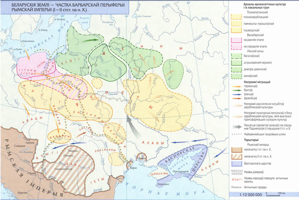 Рис. 11. Белорусские земли – часть варварской периферии Римской империи. І–ІІвв. н.э. (карта автора из издания: Гістарычны атлас Беларусі. Т. 1: Беларусь ад старажытных часоў да канца XVIII ст. Варшава, 2008. С. 37).
