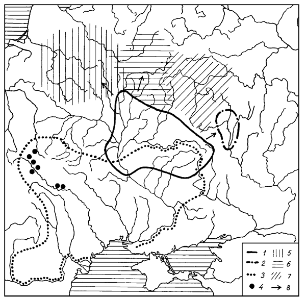 1 – киевская; 2 – типа Седелки; 3 – черняховская; 4 – типа Черепин; 5 – штрихованной керамики; 6 – днепро-двинская;7 – мощинская; 8 – направления экспансии носителей киевской культуры